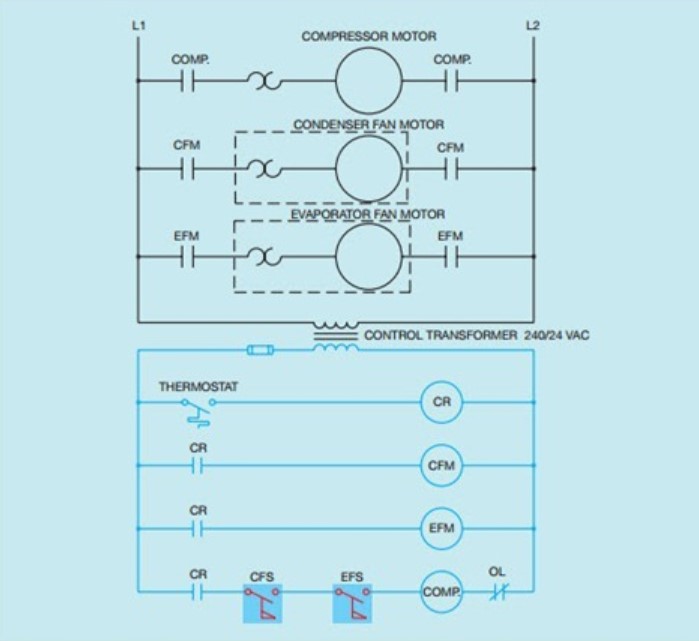請注意,在該電路中,常閉式過載觸點僅與壓縮機接觸器串聯。另請注意,冷凝器風扇電機和過載符號周圍已繪制虛線,并且在蒸發器風扇電機和過載符號周圍。這表明這些電機的過載位于電機本身上,不屬于控制電路。