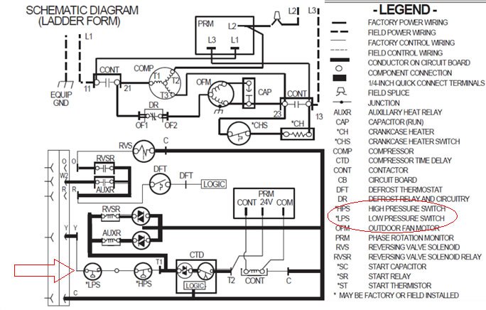 在下面的梯形圖邏輯示意圖中,您將在右下角看到一個紅色箭頭。紅色箭頭指向低壓開關,低壓開關右側是高壓開關。這些壓力開關通過Y導線或端子連接到熱泵。在這種情況下,如果其中一個壓力開關跳閘,則該控制將終止整個冷凝裝置。遵循圖中接線的邏輯,Y線穿過壓力開關,然后經過壓縮機時間延遲。從時間延遲開始,邏輯跟隨壓縮機接觸器線圈。如果你停止壓縮機接觸器線圈的電源,你將殺死整個裝置。當線圈斷電時,壓縮機接觸器接觸打開。如果其中一個制冷壓力開關打開會發生這種情況。