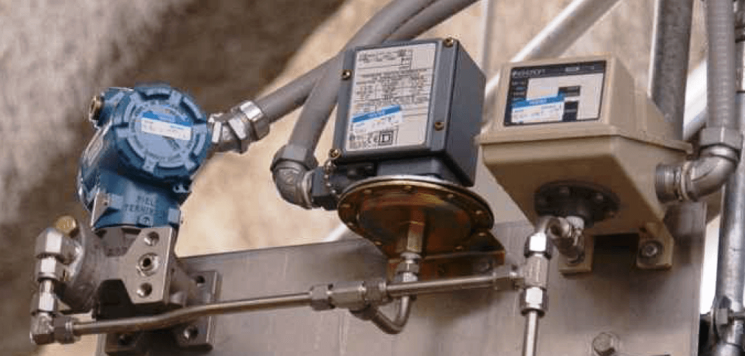下圖顯示了兩個壓力開關,它們感應到的壓力與電子壓力變送器(最左側的設備)相同,因為它們都已連接到公共管中