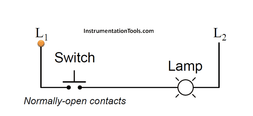 例如,下圖顯示了一個常開按鈕開關控制 120 伏交流電路上的燈(交流電源的熱極和中性極分別標記為 L1 和 L2):